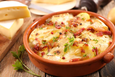 Kartoffeln kochen, pellen und in Scheiben schneiden. Zwiebel und Speck in einer Pfanne anbraten. In einer kleinen Auflaufform schichten: Kartoffeln, Speck-Zwiebel-Mix, Crème fraîche, Gewürze. Weichkäse in Scheiben schneiden und obenauf legen. Bei 200 °C ca. 20–25 Minuten überbacken, bis der Käse goldbraun ist.