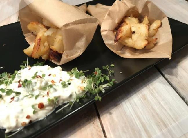 Knollen waschen uns etwa 8 Minuten in kochendem Wasser vorgaren. Abgießen, dünn schälen und vierteln. Zitrone auspressen. Das Olivenöl mit 1 EL Zitronensaft, Salz und Pfeffer verrühren. Die Topinamburstücke vorsichtig darin wenden. Auf einem Backblech verteilen und im vorgeheizten Backofen bei 200°C ca. 40 Minuten knusprig backen. In der Zwischenzeit Quark, Mayonnaise und den restlichen Zitronensaft verrühren. Den Apfel grob raspeln und unterheben. Mit Salz und den Chili abschmecken. Kresse vom Beet schneiden und ebenfalls unterrühren. Den Dip zusammen mit den Pommes servieren.