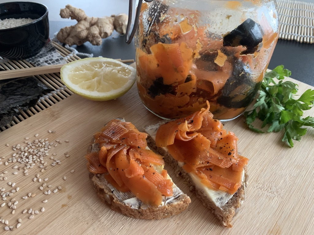Die Möhren schälen. Danach mit einem Schälmesser von der Möhre in lange Streifen abziehen. Wasser in einem Topf zum Kochen bringen und die Möhrenstreifen darin ca. 3 Minuten weichkochen. In einem Sieb abgießen und mit kaltem Wasser abspülen. Die Zutaten für die Marinade vermischen und in ein verschließbares Gefäß geben. Abgekühlte Möhren zugeben. Das Nori-Algenblatt in grobe Stücke reißen und zu den Möhren geben. Alles gut vermengen bzw. durchschütteln. Mindestens 12 Stunden im Kühlschrank ziehen lassen. Dabei immer wieder mal schwenken, damit die Marinade sich gleichmäßig verteilt.