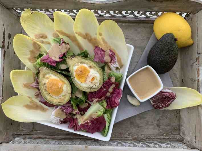 Die Avocados halbieren und den Kern entfernen. Die dadurch entstandene Vertiefung mit einem kleinen Löffel ein bisschen vergrößern. Das dadurch herausgelöste Fruchtfleisch für das Dressing zur Seite legen. Die Zitrone auspressen und mit einer kleinen Menge des Saftes die Schnittstellen der Avocados bestreichen. Die Hälften in eine Auflaufform legen, damit diese nicht umkippen am besten jede in einen großen Esslöffel als Stützhilfe legen.  Eier vorsichtig in eine Tasse aufschlagen und mit einem großen Löffel in die Avocados füllen. Evtl. bleibt ein bisschen Eiweiß übrig. Avocados mit Salz und Pfeffer würzen und bei 175° ca. 20-25 Minuten im Ofen backen, bis das Ei gar ist. In der Zwischenzeit den Salat waschen und schön anrichten. Für das Dressing den Zitronensaft mit dem Avocadofleisch und dem Cashewmus vermischen – am besten mit einem Schneebesen oder Stabmixer. Sojasoße, Agavendicksaft und gepressten Knoblauch dazugeben. Evtl. noch ein paar Esslöffel Wasser zugeben, bis das Dressing eine sämige Konsistenz hat. Mit Salz und Pfeffer abschmecken. Avocado-Eier auf dem Salat anrichten, Dressing verteilen und warm genießen.