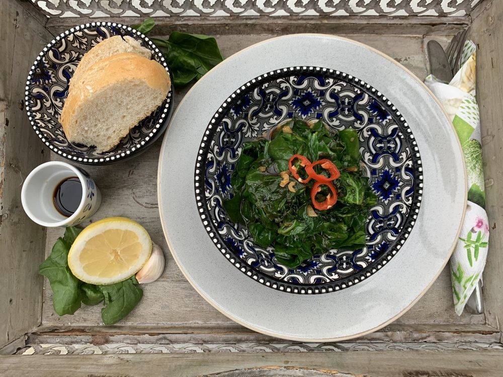 Den Spinat waschen und abtropfen lassen. Knoblauch und Chilischotenstück fein hacken. Die Butter in einer Pfanne braun werden lassen, Knoblauch und Chili kurz darin anrösten. Mit der Sojasoße und dem Zitronensaft ablöschen und ganz kurz köcheln. Den Spinat unterheben und wenden, bis dieser zusammenfällt. In 2 Schälchen anrichten und die restliche Soße aus der Pfanne darüber gießen.