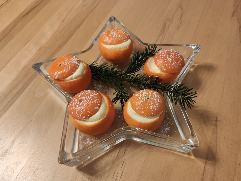 Aus der übrigen Creme Nocken abstechen und vor dem Servieren auf die Orangen geben. Die Deckel auf die Creme legen und mit Puderzucker bestäuben.