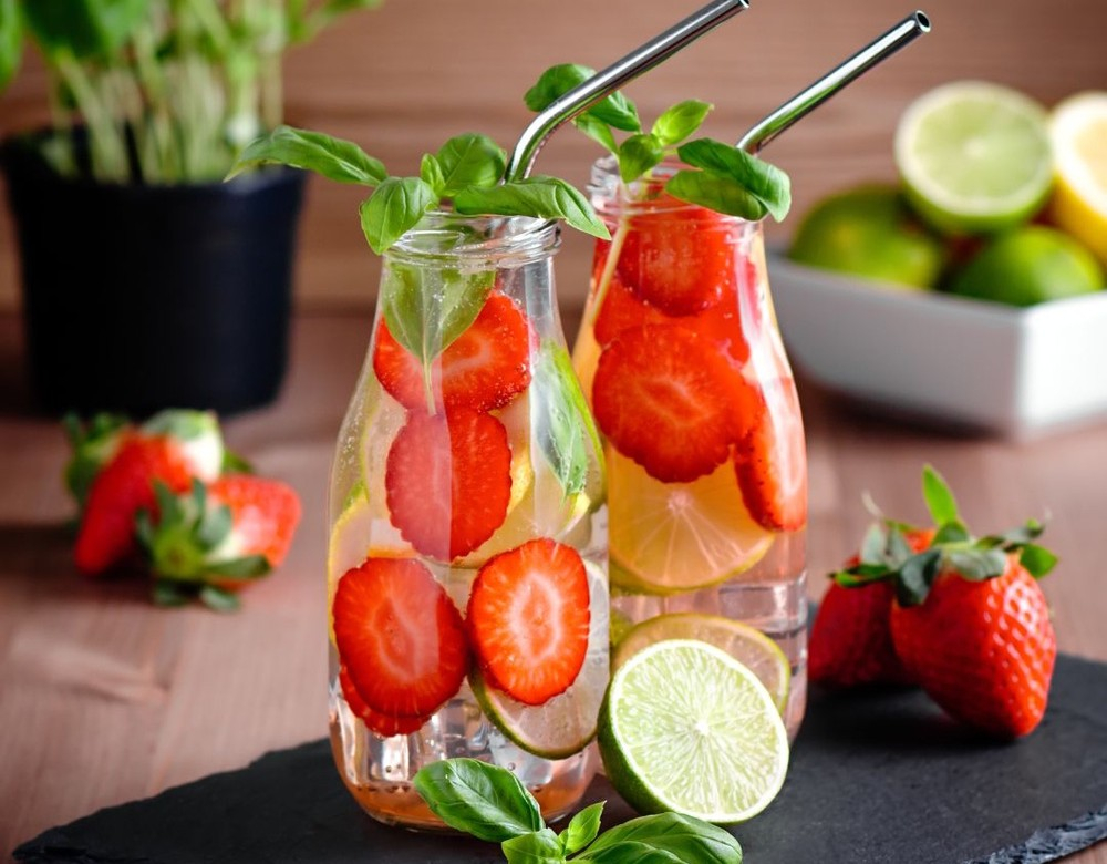 • Erdbeeren, Zitronenscheiben und Basilikum in eine Karaffe oder ein großes Glasgefäß geben.
