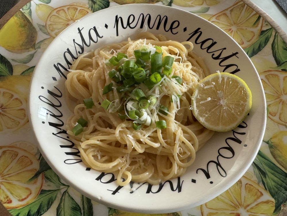 Die Schale der Zitrone mit einem Schälmesser abziehen und in 1l Wasser geben. Saft auspressen. Knoblauch pressen und mit der Butter in einer Pfanne dünsten. Ungekochte Spaghetti dazugeben und mit Zitronensaft ablöschen. Mit der Hälfte des Zitronenwassers übergießen und Nudeln in der Pfanne weichkochen. Wenn das Wasser eingezogen ist, immer wieder eine Kelle das Zitronenwassers zugeben. Währenddessen Parmesan reiben und 2/3 am Ende der Garzeit zu den Nudeln geben. Wenn die Nudeln al dente sind mit Salz und Pfeffer würzen. Frühlingszwiebeln schneiden und mit dem Parmesan über die fertigen Nudeln geben.