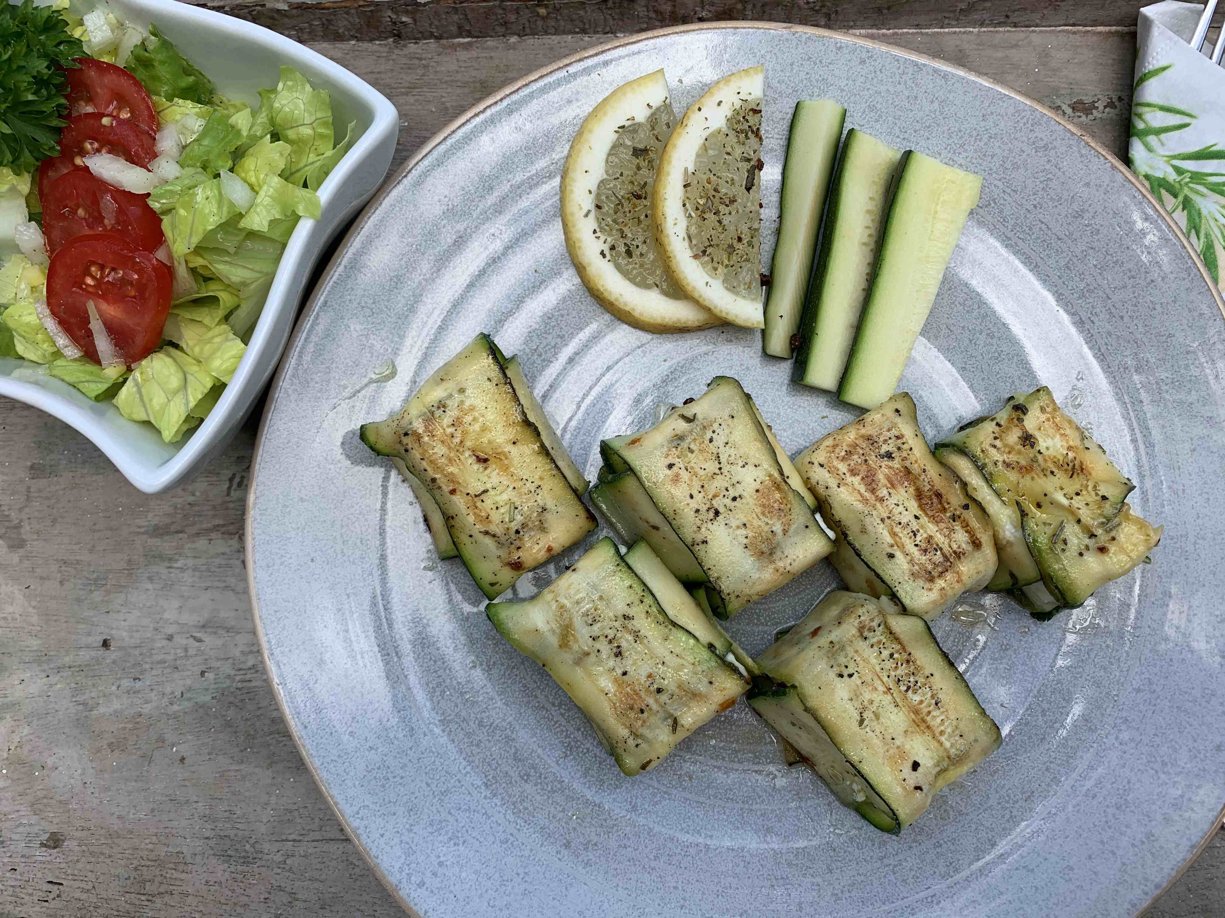 Die Zucchini längs halbieren und mit dem Schälmesser dünne, breite Streifen abziehen. Salzen und kurz ziehen lassen. Den Feta in 6 Stücke teilen. Die Zucchinischeiben trocknen und mit Olivenöl bestreichen. 2 Zucchinistreifen längs und quer übereinanderlegen. Ein Stück Feta in die Mitte legen, mit ein wenig Zitronensaft beträufeln oder etwas Abrieb bestreuen. Mit den italienischen Kräutern würzen. Das Päckchen schließen (zuerst mit dem unteren Zucchinistreifen) und mit der offenen Seite nach unten legen. Mit Pfeffer (am besten aus der Mühle) würzen und von beiden Seiten grillen.
