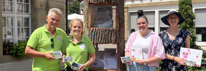Ende Juni durften wir unsere Heidelbeeren am Rathaus in Brackenheim vorstellen – frisch geerntet, in bester Bio-Qualität und direkt aus unseren Obstanlagen im Zabergäu. Ein schöner Anlass im Rahmen des KLIMA 365-Projekts, das zeigt: Klimaschutz beginnt direkt vor der Haustür – beim Anbau, beim Einkauf, beim Genuss.