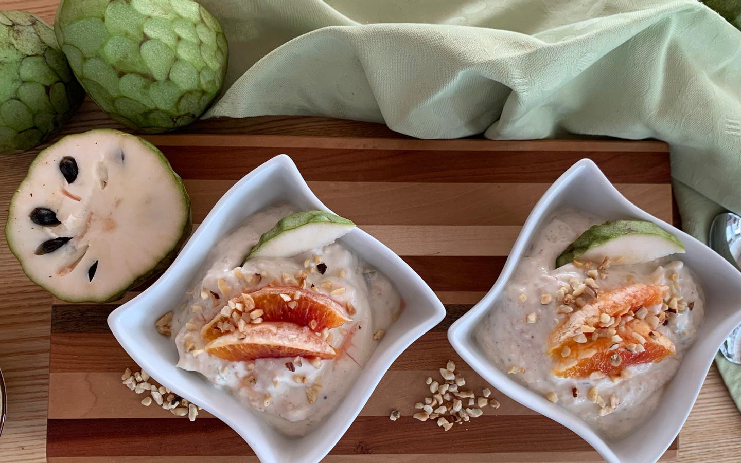 Die Cherimoya halbieren und die Kerne entfernen. Die Frucht mit (weicher) Schale würfeln. Die Orange halbieren und die Cherimoya mit etwas Orangensaft beträufeln. Die Orange dann schälen und in kleine Stücke schneiden. Den Sojaquark mit Agavendicksaft und den beiden Obstsorten mischen. Das Amaranth unterheben. Das Dessert in kleine Schälchen anrichten und mit den gehackten Nüssen bestreuen.
