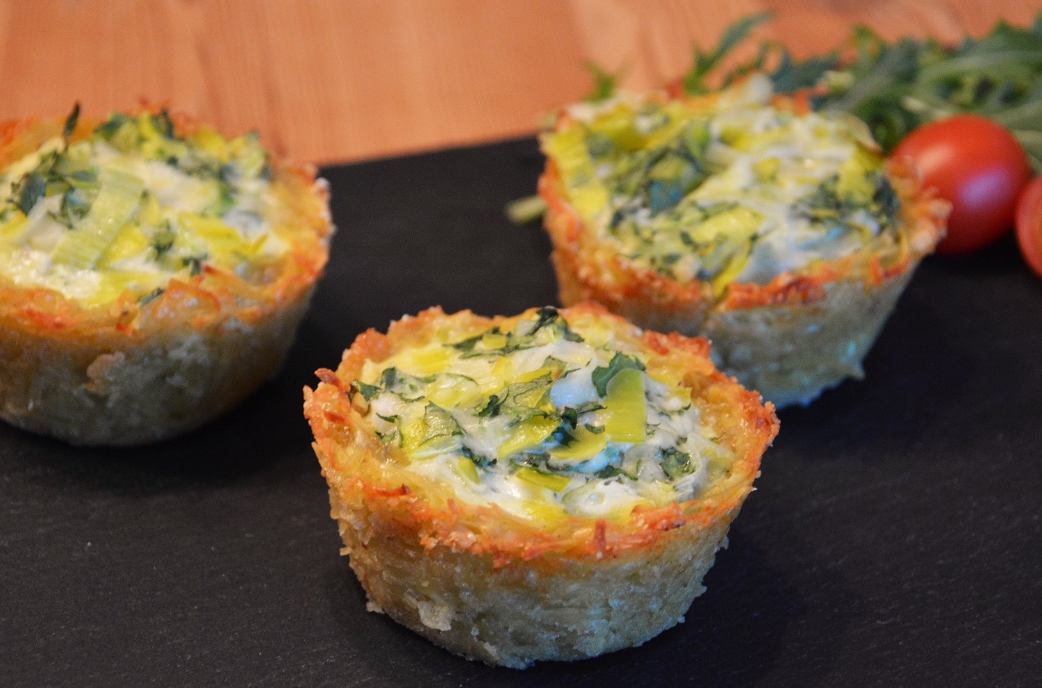 Lauch waschen, putzen und in feine Streifen schneiden. In etwas Olivenöl andünsten bis er weich ist und abkühlen lassen. Den Käse grob raspeln. Die Kartoffeln schälen, waschen und ebenfalls raspeln. In einer Schüssel mit etwas Salz, Pfeffer und 60 g geraspeltem Käse vermischen. Die Muffinform mit Butter bestreichen und mit Paniermehl bestreuen. Die Kartoffel-Käse-Masse gleichmäßig darauf verteilen. Jeweils mit den Fingern am Boden andrücken und an den Rändern hochziehen, sodass kleine Nester entstehen. Im vorgeheizten Backofen bei 200°C 15 - 18 Minuten backen, bis die Kartoffeln fast gar und an den Spitzen leicht gebräunt sind. Inzwischen Asia Mix waschen und fein hacken. Zusammen mit den Eiern, Sauerrahm, Senf, dem restlichen Käse, Salz und etwas Pfeffer gut verrühren. Zum Schluss den Lauch unterheben. Die Masse mit einem Teelöffel in die vorgegarten Kartoffelnester verteilen und zusammen nochmal ca. 15 Minuten im Ofen backen, bis die Masse gestockt ist. Sofort servieren.
