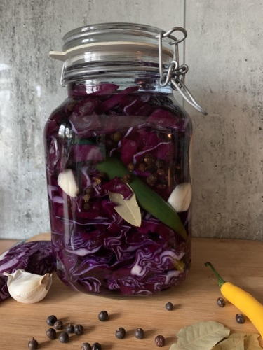 Gläser mit Zubehör heiß auskochen und auskühlen lassen. Je nach benötigter Menge die Salzlake herstellen. Auf 1 Liter kaltes Wasser 20-30g Salz zugeben, immer wieder rühren und auflösen lassen. Den Rotkohl in Stücke schneiden. Die Knoblauchzehen schälen. Jetzt die 1. Lage Rotkohl ins Glas schichten. Chilischote und Knoblauchzehen am Rand platzieren. Wachholderbeeren ebenfalls ins Glas geben. Danach den restlichen Rotkohl darüber schichten. Der Kohl kann ruhig ein bisschen nach unten gedrückt werden. Die Salzlake aufrühren und ins Gas gießen, so dass alles bedeckt ist. Danach einen Fermentierstein darauflegen, damit der Inhalt nicht nach oben schwimmt. Der Inhalt muss jederzeit mit der Salzlake bedeckt sein. Sollte einmal zu wenig Salzlake im Glas sein, kann diese jederzeit nachgegossen werden. Glas verschließen (Twist Off nur locker verschrauben). An einem warmen Ort, abgedunkelt 2 Wochen stehen lassen. Am besten in der Küche mit einem Geschirrtuch abgedeckt. Einen tiefen Teller oder ähnliches darunter stellen. Da das Ferment nach wenigen Tagen beginnt "zu arbeiten", es steigen kleine Bläschen auf und es kann passieren, dass die Lake aus dem Glas läuft. Danach das Gemüse noch für 2 Wochen an einem kühleren Ort z.B. im Keller weiter fermentieren lassen. Immer darauf achten, dass genügend Lake im Glas ist. Fertig ist das fermentierte Gemüse, wenn es würzig lecker schmeckt.