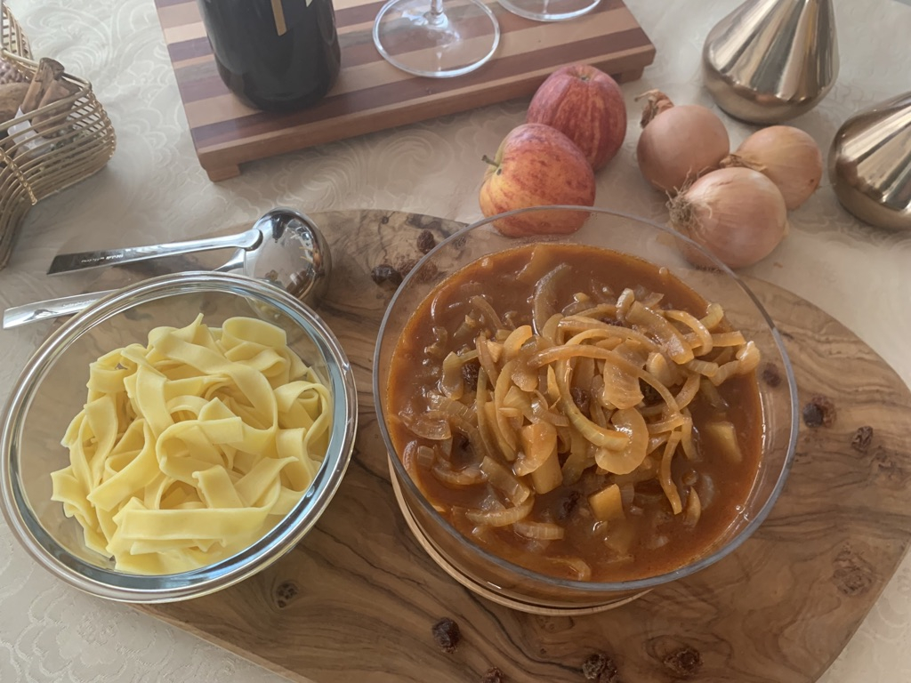 Die Zwiebeln schälen und halbieren. Quer in etwa 2mm dicke Halbringe schneiden. Knoblauch ebenfalls schälen und fein würfeln. Auch den Apfel schälen und in kleine Würfel schneiden. Butter/Öl in einer Pfanne erhitzen und die Zwiebeln, Apfelstücke und den Knoblauch darin mit etwas Salz und dem Rohrohrzucker kräftig anbraten. Tomatenmark und Mehl zugeben und kurz anrösten. Mit 400ml Wasser und dem Rotwein ablöschen. Sojasoße, Pfeffer und wer mag die Rosinen zugeben und im geschlossenen Topf bei niedriger Hitze etwa 20 Minuten einköcheln lassen.
