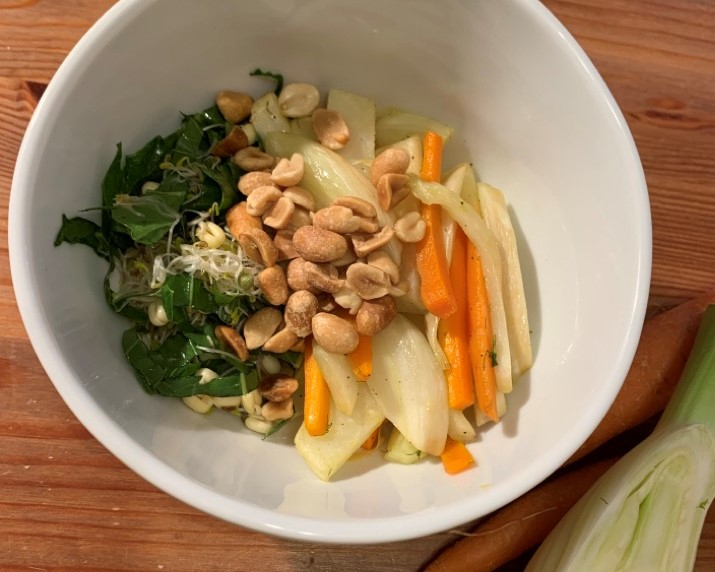 Die Blätter vom Kohlrabi entfernen, kleinschneiden und mit den Sprossen in einem Sieb waschen. Den Kohlrabi schälen und in kleine schmale Stifte schneiden. Die Möhren und den Fenchel ebenso. Aus den Zutaten für das Dressing die Bowl-Soße herstellen. Die Erdnüsse in einer Pfanne ohne Öl anrösten und zur Seite stellen. Olivenöl in die Pfanne geben und die Möhren- und Kohlrabistifte und den Fenchel andünsten – aber knackig lassen. Mit dem Rauchsalz und Pfeffer in der Pfanne noch würzen. Die Kohlrabiblätter und die Sprossen mit dem Dressing vermengen und in eine Schale geben. Seitlich ein bisschen Platz lassen und dort das Pfannengemüse anrichten. Den EL Zitronensaft und die Erdnüsse über der Bowl verteilen – fertig.