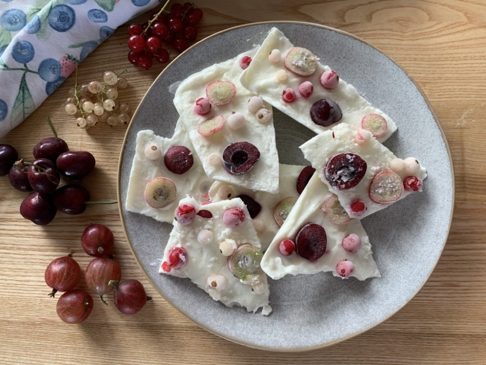 • Skyr dünn in eine Platte oder Auflaufform streichen. Achtung: Diese muss nachher in deinen Gefrierschrank/Fach passen! Beeren darauf verteilen und mindestens 3 Stunden gefrieren lassen.