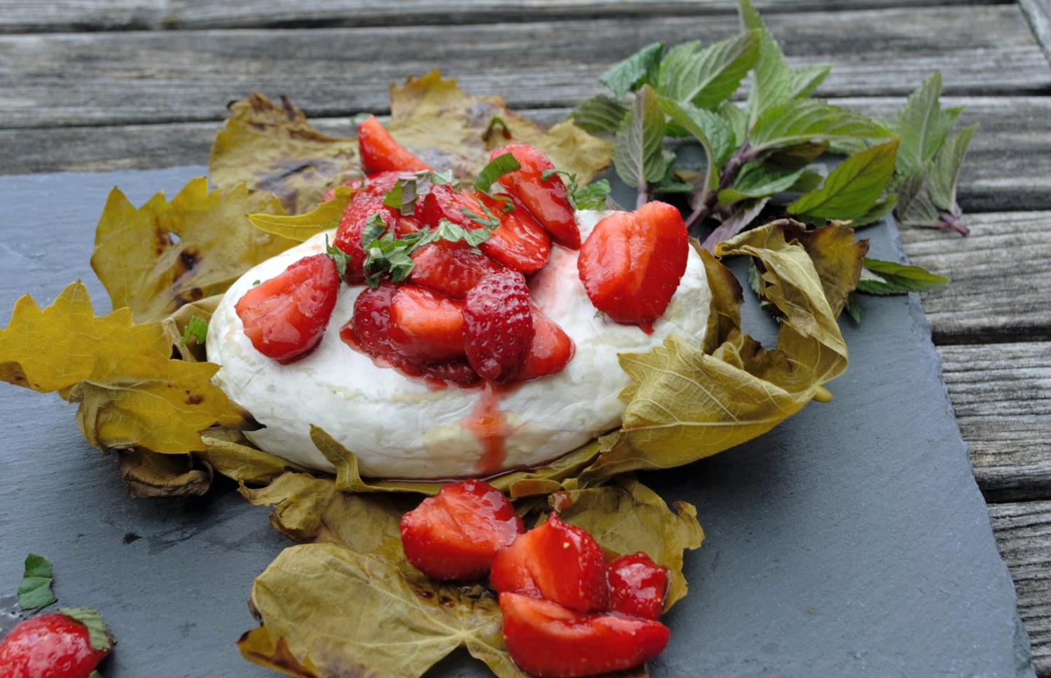Gegrillter Camembert in Weinbergblätter mit Erdbeeren