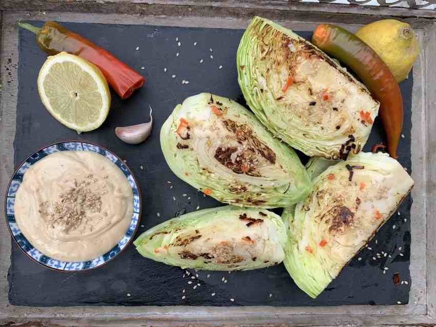 Den Spitzkohl längs in 4 Spalten schneiden. Evtl. den Strunk ein bisschen kürzen. Butter zerlassen, Knoblauch und Chilischote sehr fein hacken und kurz anschwitzen. Sojasoße dazugeben. Die Schnittflächen des Kohls großzügig damit bepinseln. Die Zutaten für das Dressing vermengen. Evtl. ein bisschen Wasser zugeben, dass eine cremige Konsistenz erreicht wird. Kohlstücke auf die Seiten des Grillrostes legen - auf indirekte Hitze achten, damit es nicht zu heiß ist. Jede Seite etwa 5 Minuten grillen. Gegrillten Kohl mit dem Dressing beträufeln und mit Sesam bestreuen.