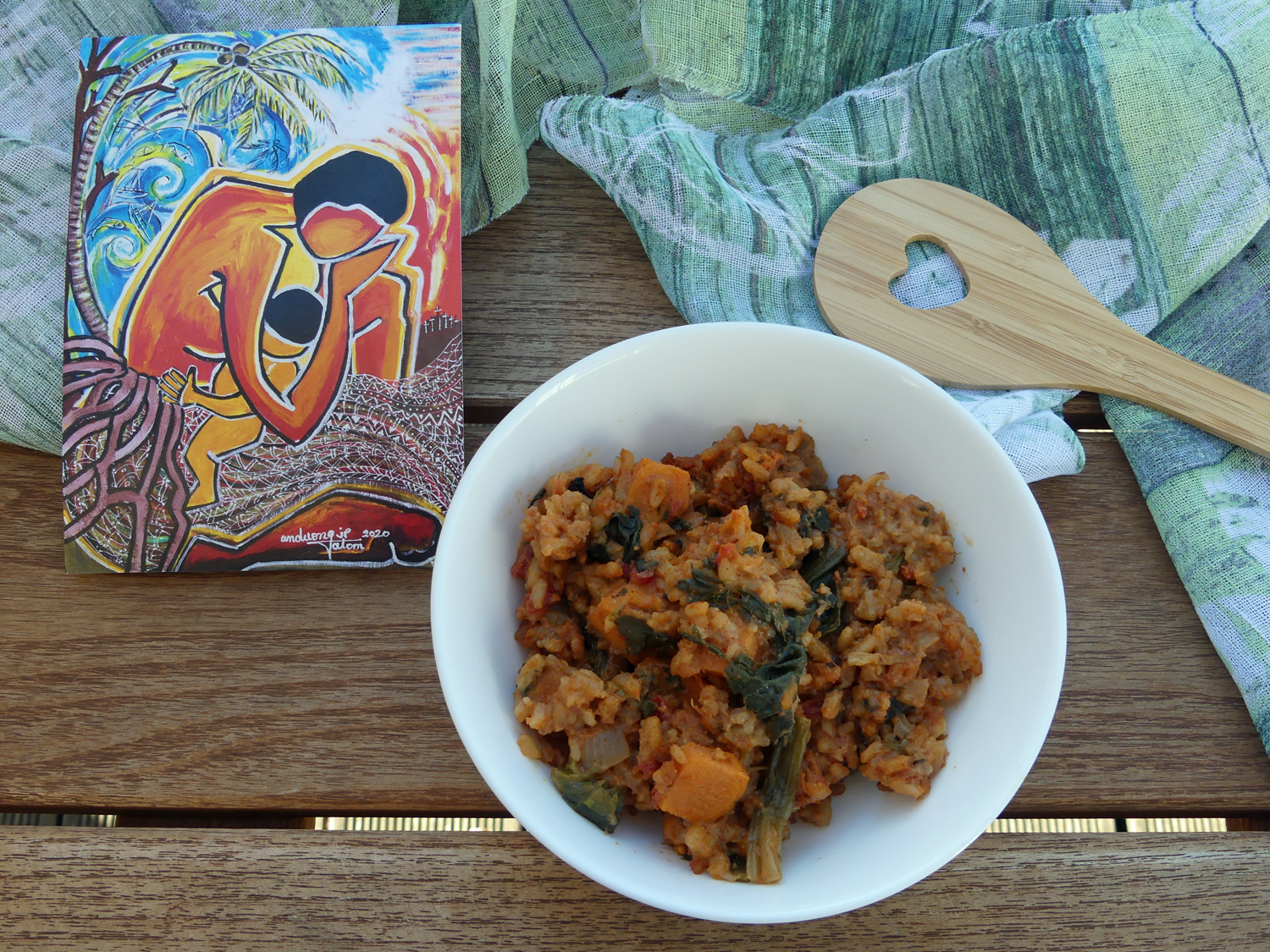 Öl in einem Topf erhitzen und Zwiebeln anschwitzen. Hitze reduzieren, Reis und Batate dazugeben. Vermischen und ebenfalls anbraten. Dabei umrühren und achten, dass nichts am Topfboden haften bleibt. Spinat zugeben und so lange anschwitzen, bis dieser zusammenfällt. Gemüsebrühe angießen und die Sojasoße dazugeben. Kokosmilch und Tomatenstücke zugeben. Mit Curry, Kurkuma und Salz würzen. Zum Kochen bringen, dann die Hitze reduzieren und etwa 15 Minuten köcheln lassen.