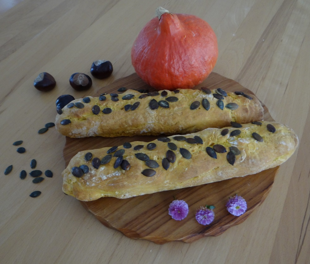 Kleine Kürbisstücke mit dem Wasser aufkochen, ca. 10 min köcheln lassen. Anschließend pürieren und auf Zimmertemperatur abkühlen lassen. Milch, Zucker und Hefe vermischen, abgedeckt 30 min gehen lassen. Das abgekühlte Püree, Mehl, Salz und Muskat zugeben und zu einem geschmeidigen Teig kneten. Abgedeckt ca. 30 min gehen lassen. Aus dem Teig ca. 6 Brötchen oder 2 Baguettestangen formen, mit Wasser bestreichen und mit Kürbiskernen bestreuen. Weitere 15 min gehen lassen.