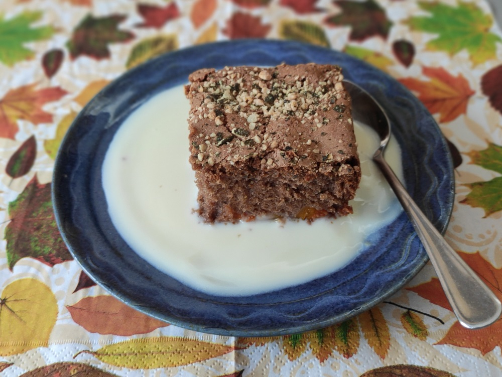 Den noch leicht warmen Kuchen in kleine Stücke schneiden und auf einem Teller mit Vanillesoße anrichten.