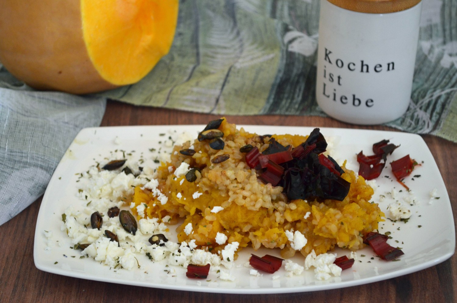 • Feta zerbröseln, mit den Kürbiskernen mischen und zum Reis-Kürbisgemisch servieren .