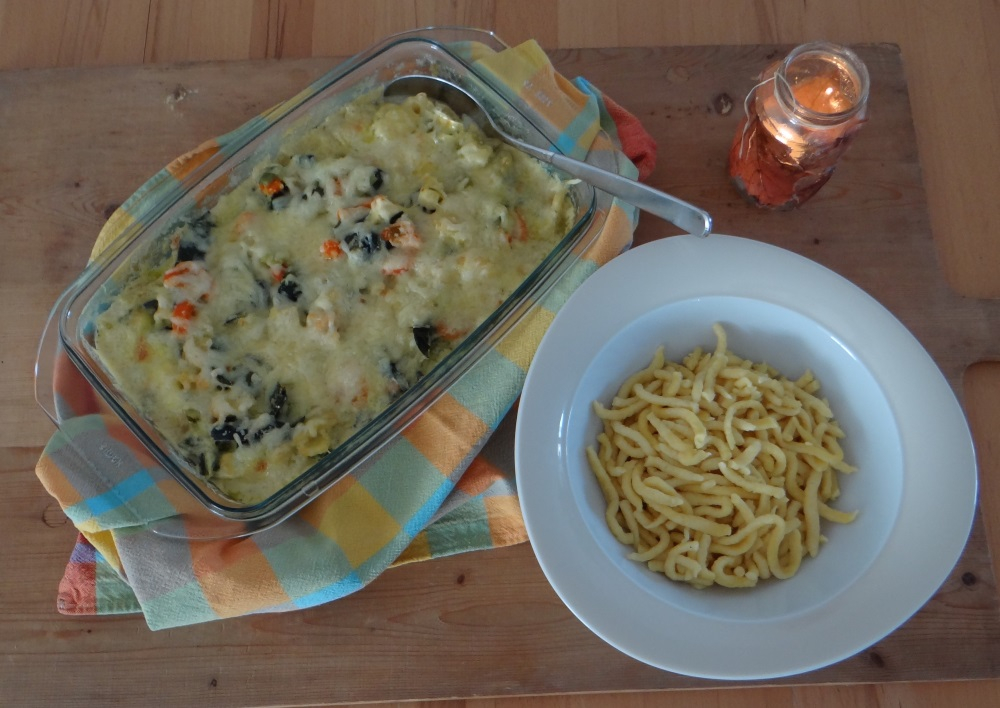 Im vorgeheizten Backofen weitere 25min überbacken, bis der Käse leicht braun ist.