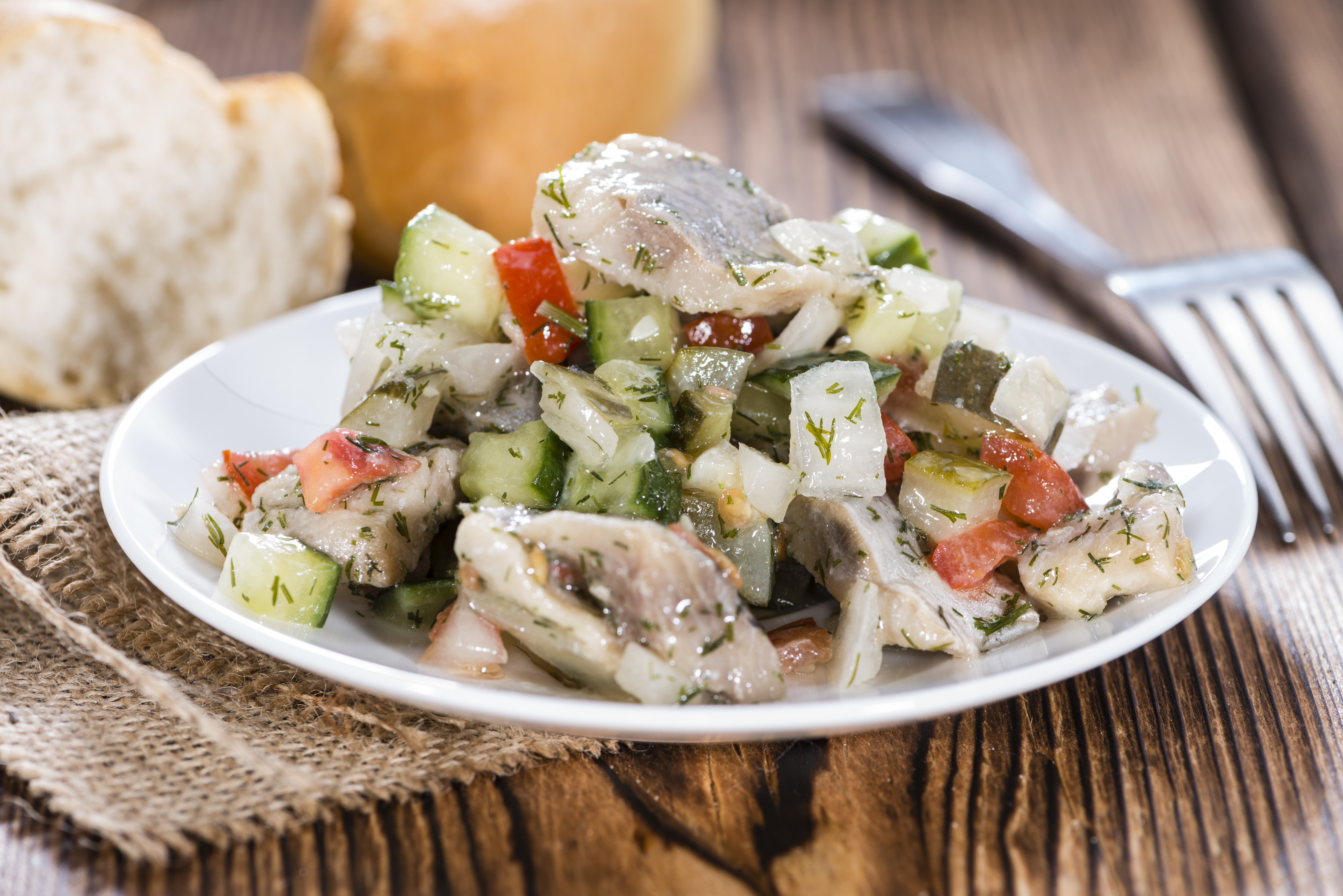 die Matjesfilet kalt abwaschen und mit einem Küchenkrepp trocken tupfen, kleinschneiden und in eine Schüssel geben,