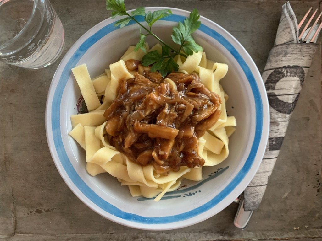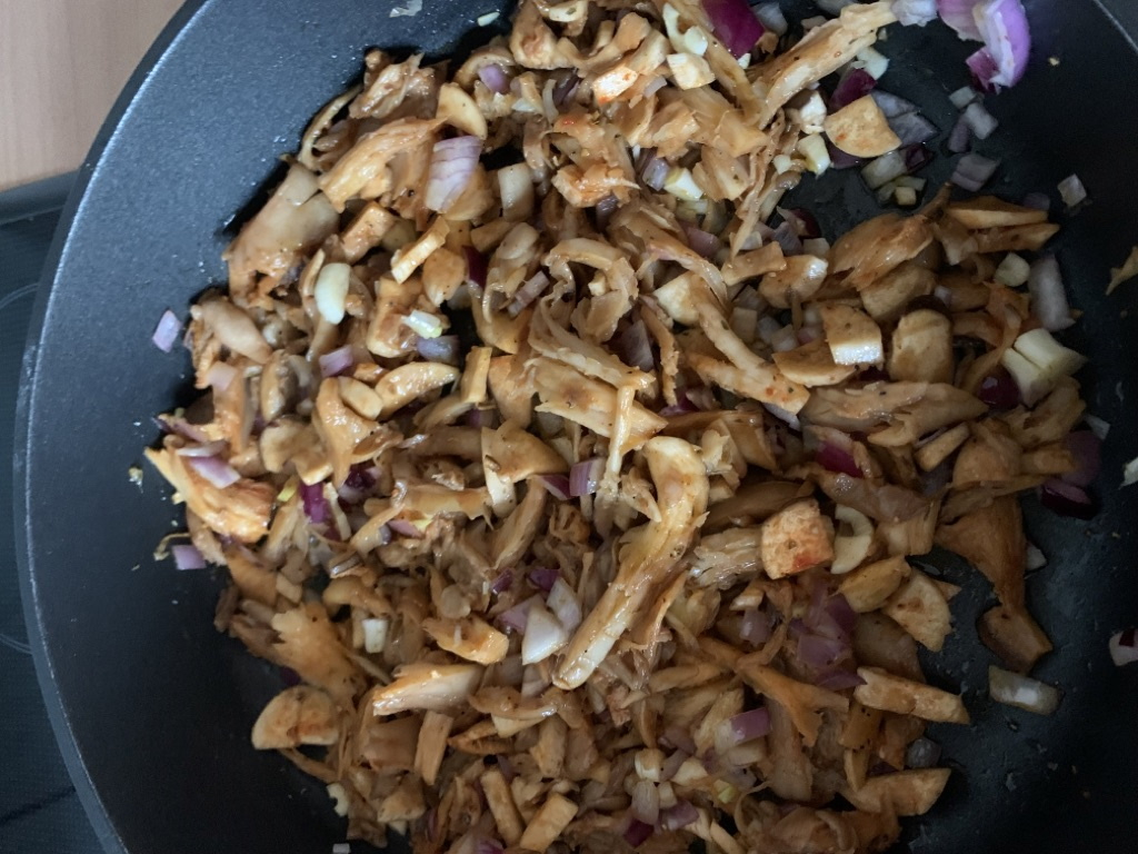Die Austernpilze mit einer Pilzbürste oder einem Küchentuch säubern. Das untere Ende festhalten und mit einer Gabel der Länge nach, die Pilze in Streifen rupfen. So entstehen die klassischen „pulled“ Stücke. Marinade zubereiten und die Pilzstücke darin für marinieren. Zwiebel und Knoblauch kleinschneiden. Öl in einer Pfanne erhitzen und die Pilze mit dem Zwiebeln und Knoblauch kräftig anbraten. Etwas einkochen lassen. Wer die Soße noch verlängern möchte, kann noch etwas Wasser und Sojasoße zugeben und diese evtl. mit 1 TL Speisestärke abbinden.