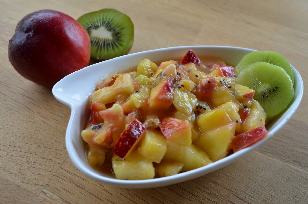 Chili, Ingwer, 1 EL Zucker und die Pfefferkörner mit dem Ananassaft vermengen und einköcheln lassen, bis der Saft andickt,