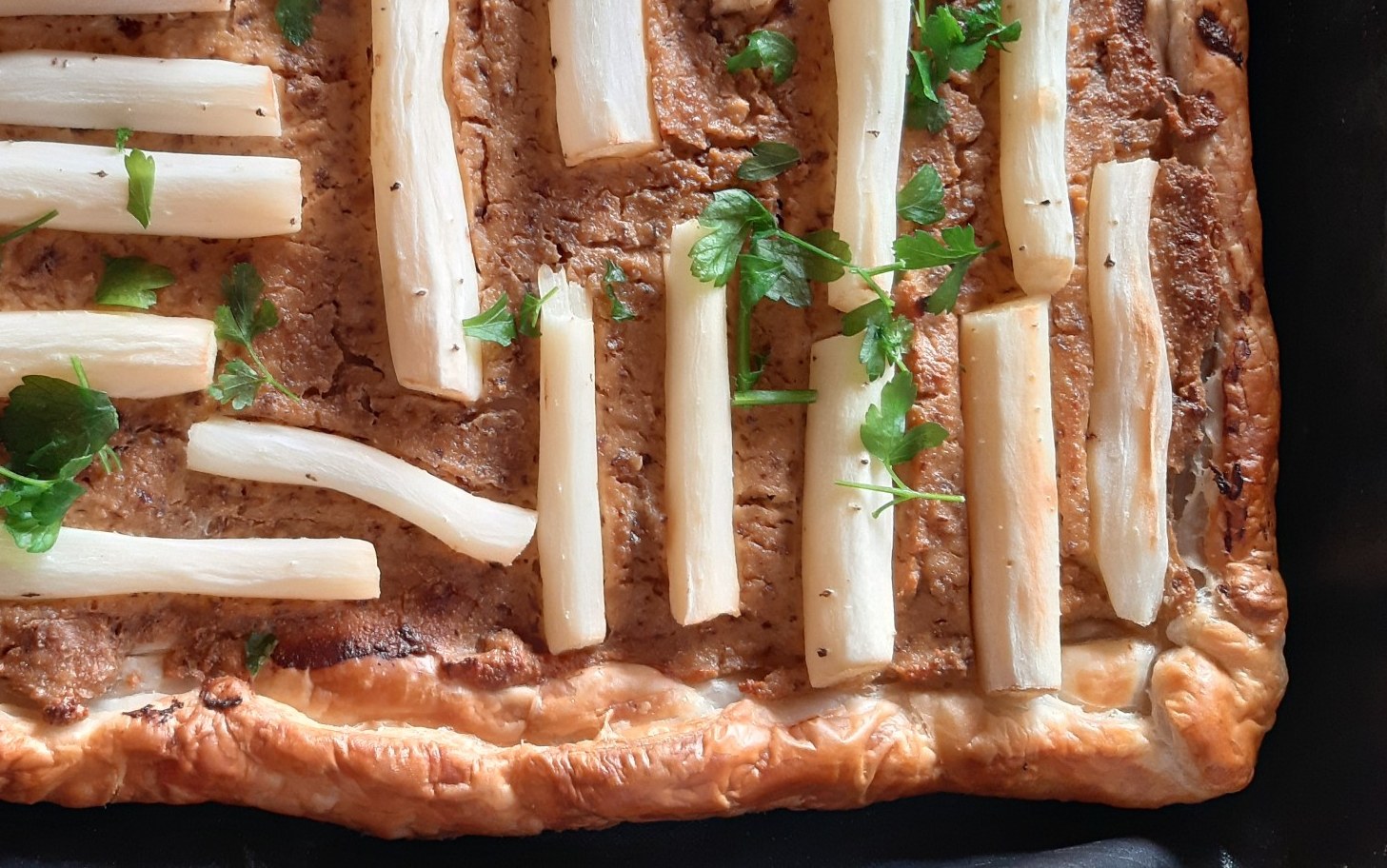 • Tofumasse innerhalb des eingeritzten Rechtecks verteilen und mit den blanchierten Schwarzwurzelstangen belegen. Tarte 30 Minuten auf der mittleren Schiene backen, anschließend fein gehackte Kräuter und Pfeffer darüber streuen.