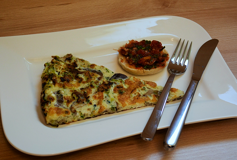• die Eiermasse über das Gemüse geben, einen Deckel auf die Pfanne legen und das Ganze ca. 5 Minuten braten,