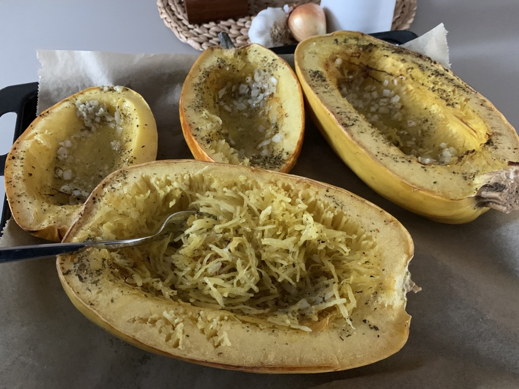 Kürbis halbieren und die Kerne entfernen. Zwiebel und Knoblauch kleinschneiden/pressen und im Kürbis verteilen. Mit Salz und Pfeffer würzen und mit Olivenölbestreichen. Die Hälften für ca. 40 Minuten bei 180°C im Backofen backen. Wenn sich das Fruchtfleisch mit einer Gabel in kleine „Spaghetti“ lösen lässt, ist der Kürbis gar. Alles vermengen und direkt aus dem Kürbis genießen.