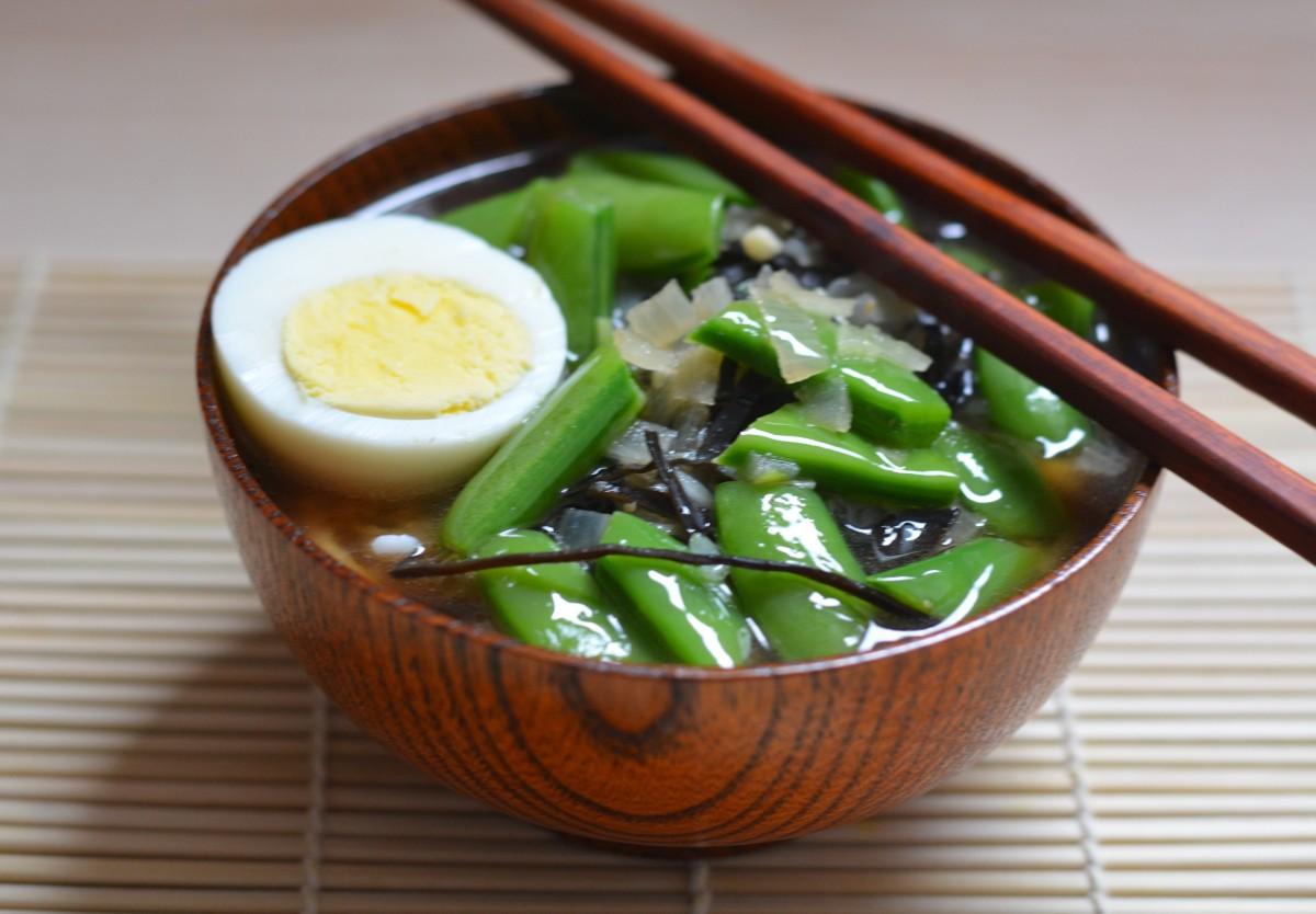 die Zuckererbsen waschen, Enden abknipsen und eventuell Fäden abziehen,
