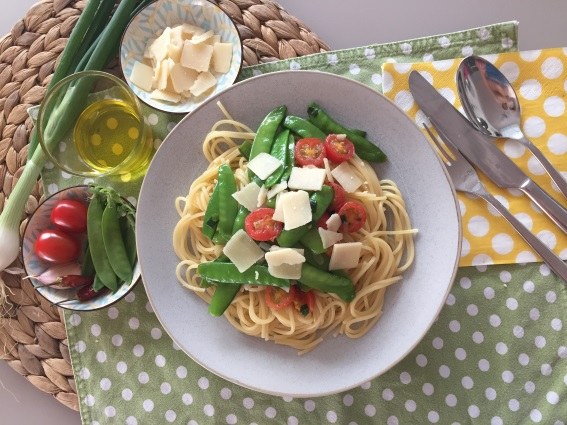 Die Enden der Zuckererbsen kappen und  den kleinen „Faden“ mit abziehen. Bundzwiebeln in Ringe schneiden, Knoblauch hacken, Chilischote fein würfeln  und Tomaten halbieren. Nudelwasser aufsetzen und Nudeln nebenbei kochen. Öl in einer Pfanne erhitzen und alles Gemüse anbraten, so dass die Zuckererbsen schön knackig bleiben. Mit Salz und Pfeffer würzen. Fertige Nudeln in die Pfanne geben und durch das Gemüse/Öl schwenken.  Auf einem Teller anrichten. Pecorino grob hobeln und über die fertige Pasta geben.