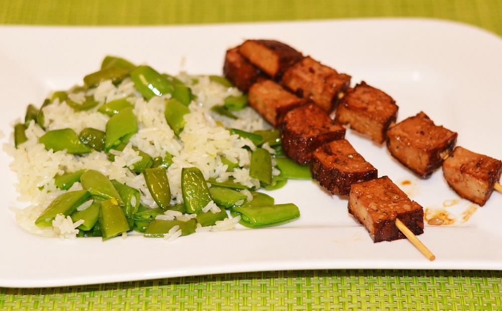 Zuckererbsen-Reis mit Tofu-Spießen