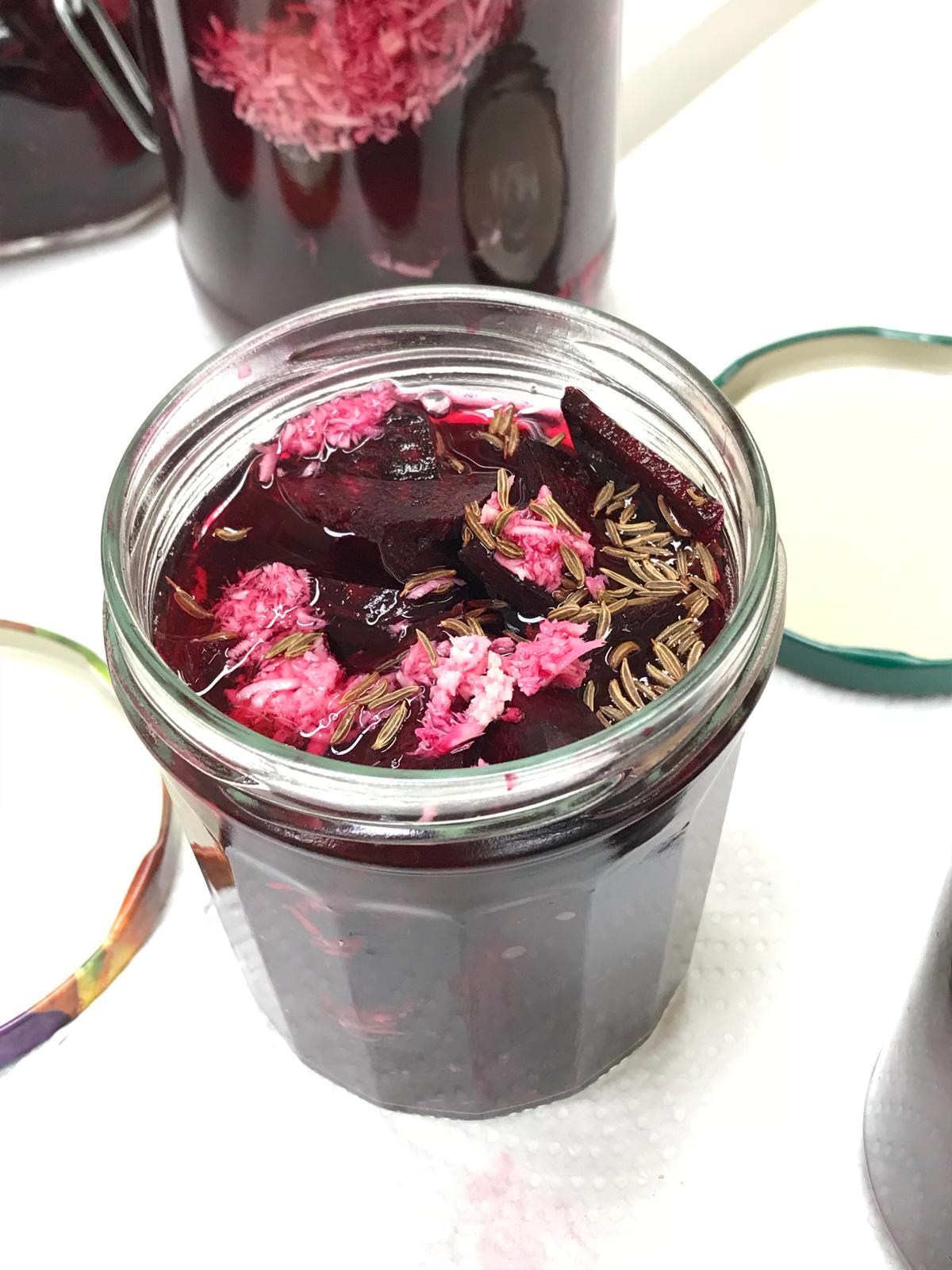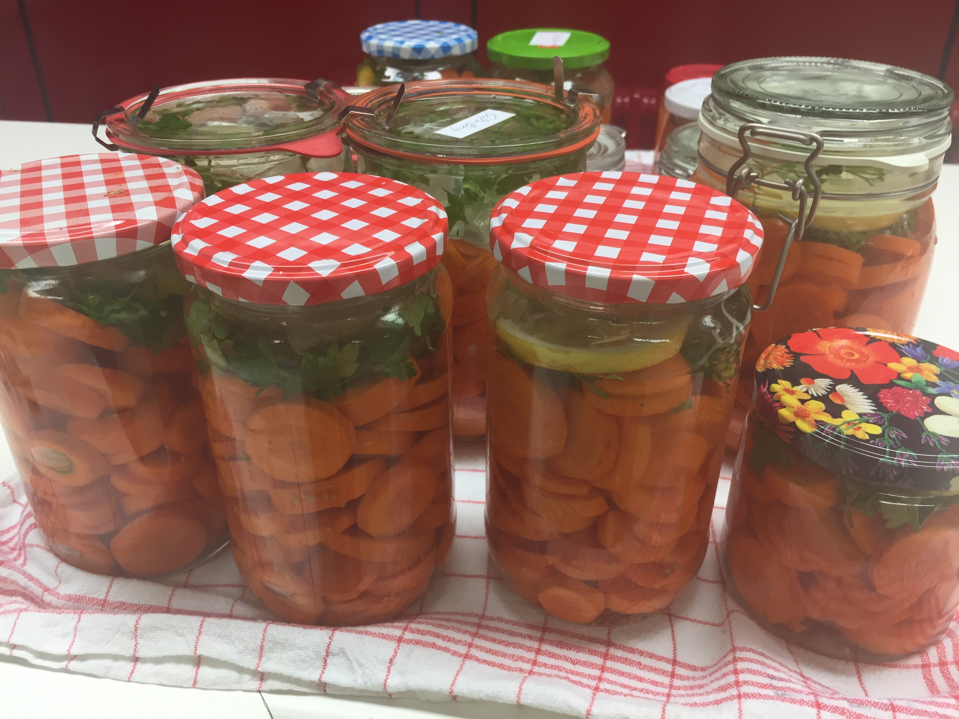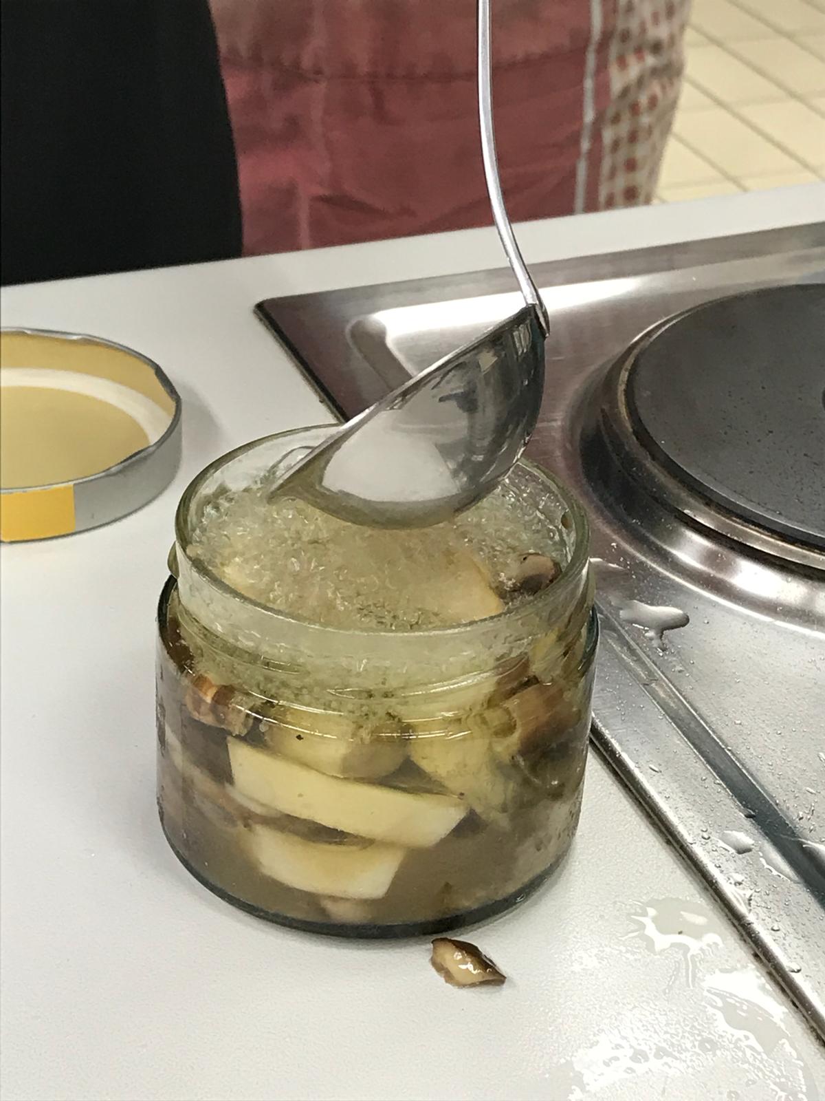 Mit viel Spaß wurden Möhren, Rotkohl, Kürbis, Rote Bete, Pilze und Birnen geschnippelt. Einkochen, Einlegen - sauer oder in Öl und Fermentieren standen auf dem Programm. Mit Gewürzen verfeinert und so schmackhaft in die Gläser gebracht. Nach getaner Arbeit und während manche Gläser noch zum Pasteurisieren im Backofen waren gab es Vesper. Mit Brot, Brötchen, Käse, Wurst, Aufstrichen und süßen Leckereien konnte der Abend bei einem Glas Wein oder Saft ausklingen. Schwer bepackt mit bunt gefüllten Gläsern gingen die Teilnehmer dann nach Hause.