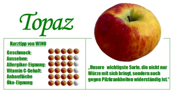 Rezepte: Aufgrund des leicht säuerlichen und des sehr saftigen Fruchtfleischs kommt der Topaz besonders in Suppen (Hokaidosuppe mit Äpfeln) und Säften (Vitamincocktail) zur Geltung. Aber auch in einem Salat (Salat aus Äpfeln und Paprika) und in einem Müsli (Müsli mit Äpfeln (braucht Einweichzeit)) oder Nachtisch (Landdessert) schmeckt er exzellent.