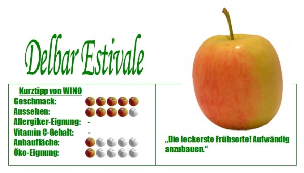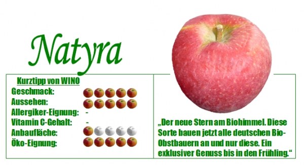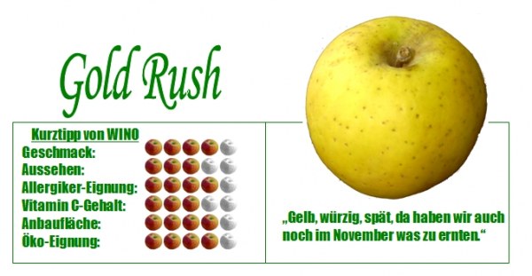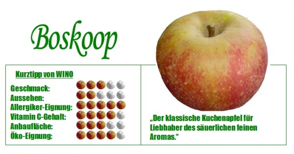 Sonstiges: Die anspruchsvolle Sorte braucht ein warmes Klima; Rekordhalter im Vitamin C-Gehalt (ca.24 mg pro Apfel)