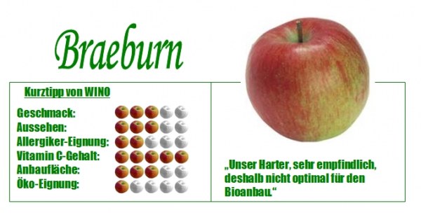 Rezepte: Der Braeburn lässt sich gut zu Apfelmus (Selleriepuffer mit Zwiebel-Apfelmus) und zu einem Obstsalat verarbeiten. Außerdem eignet er sich gut in einer Bowle oder in einer Apfeltorte.
