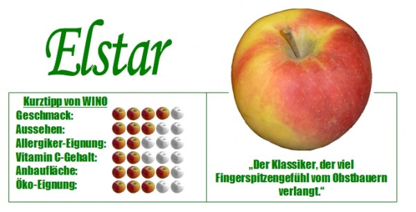 Herkunft: Elstar ist eine Kreuzung aus „Golden Delicious“ und „Ingrid Marie“, 1955 im Institut von Wageningen, Niederlande, entstanden. Seit 1978 unter Sortenschutz.