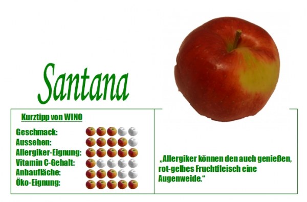 Herkunft: Santana ist eine neue Spätherbstsorte, gekreuzt aus „Elstar“ und „Priscilla“ in Wageningen, Niederlanden.